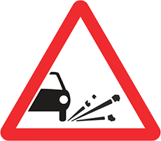 warns that the road user is approaching a section of payed road where gravel thrown up by wheels may endanger road users and vehicles
