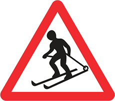 warns that the road intersects a ski trail or that skiers or sledders may appear on the road