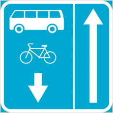 обозначается дорога, по которой движение транспортных средств общего пользования, велосипедов, мопедов и мини-мопедов осуществляется по специально выделенной полосе навстречу общему потоку транспортных средств