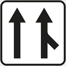 указывает число полос для движения нерельсовых транспортных средств по одной стороне движения или по всей ширине дороги на участке до ближайшего перекрестка или до места пересечения с дорогой подъездных путей от прилегающих к дороге территорий и обязательное направление движения с каждой полосы на перекрестке или в месте пересечения с дорогой подъездных путей от прилегающих к дороге территорий. Действие знаков 53, расположенных перед перекрестком или местом пересечения с дорогой подъездных путей от прилегающих к дороге территорий, распространяется на весь перекресток или на всю зону пересечения с дорогой подъездных путей от прилегающих к дороге территорий, если другие знаки 53, установленные на них, не дают иных указаний. Установленные в населенных пунктах знаки 53 имеют белый фон с черными стрелками и каймой. Знаком 533av обозначаются направления движения на полосах попутного направления, если для присоединяющегося потока транспортных средств не имеется отдельной полосы движения (независимо от наличия полосы разгона)